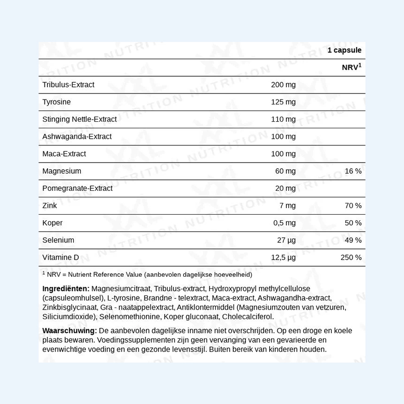 XXL Nutrition is een van de bekendste merken in Nederland en hun Test Support is een product dat je vaak ziet langskomen. De formule combineert een breed scala aan kruidenextracten zoals tribulus (600 mg), maca (300 mg), brandnetel (330 mg) en ashwagandha (300 mg). Dat maakt het een veelzijdige mix die inspeelt op verschillende hoeken.