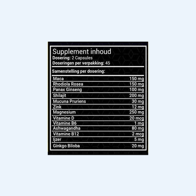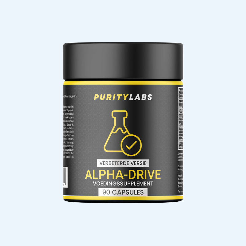 Alpha-Drive van PurityLabs kiest voor een brede benadering. De formule bevat plantenextracten zoals maca (150 mg), rhodiola (150 mg), panax ginseng (100 mg), shilajit (200 mg) en ginkgo biloba (20 mg). Daarbovenop komt een basis van 12 mg zink, 250 mg magnesium, 20 µg vitamine D en vitamine B6 en B12.